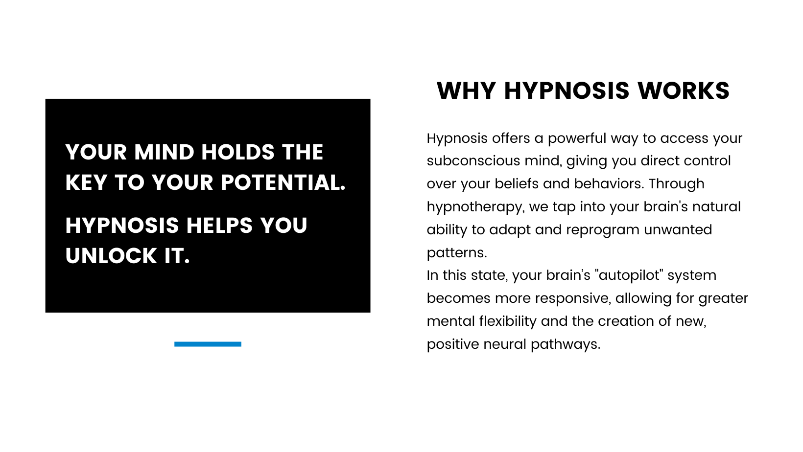 Hypnosis unlocks your inner motivation by reprogramming limiting beliefs and boosting your confidence. It helps you stay focused, overcome obstacles, and achieve your goals with ease.
